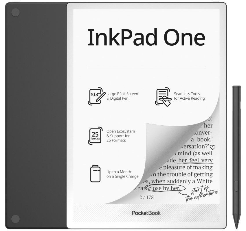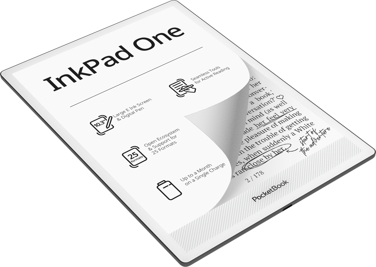 PocketBook introduserer InkPad One, en ny 10,3-tommers e-leser med penn, som er designet for aktiv lesing og komfortabel håndskrift. Enheten har en papirlignende E Ink Mobius™-skjerm og leveres med en digital penn for naturlig notatskriving, samt flere innebygde verktøy for håndskrift. InkPad One er en rimelig løsning for storskjerm for lesing, skriving og daglig produktivitet.
